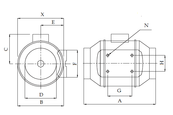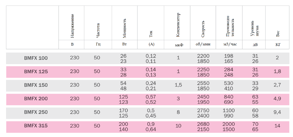 - Вентилятор изготовлен из пластика (модели BFMX 100 – BFMX 200), а у моделей BFMX 250 и BFMX 315 стальной корпус покрытый электростатической порошковой краской.