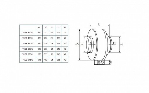 ентилятор TUBE 250 XL применяется для перемещения воздуха в круглых каналах систем приточной и вытяжной вентиляции жилых, общественных и производственных помещений.