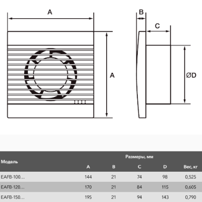 Все вентиляторы серии оснащены современным энергоэффективным электродвигателем с японскими подшипниками качения; пружинным обратным клапаном для предотвращения попадания пыли и запахов из вентиляционного канала; кабельным выводом с разъемом для удобства монтажа. Корпус вентилятора выполнен из высококачественного АБС-пластика.